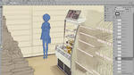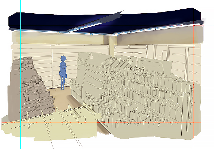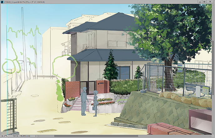前回言った奥から塗るに通じるものがありますが、レイヤーをわけまるくようになった今回の様な場合、遠近による空気の層を表現するために、段階的に分けておかないと最終調整がめんどくせいという当たり前のことに気づきました。